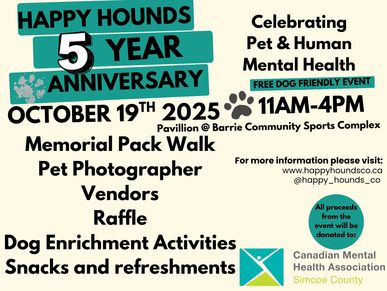 On October 19th, 2025 Happy Hounds proudly marks five incredible years of wagging tails, forest adventures, and community connection. The celebration at the Barrie Community Sports Complex will support the CMHA, with all proceeds being donated to their organization. Our theme celebrates wellness for pets and humans alike. From 11-4pm, the event will feature dog enrichment activities, local vendors, and a heartfelt memorial walk honoring our friend and former dog walker.